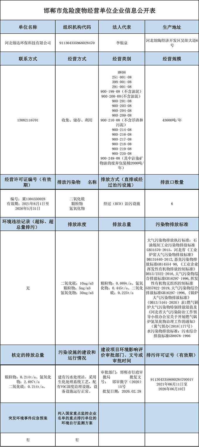 邯鄲市危險廢物經(jīng)營單位企業(yè)信息公開表-河北镕達(dá)環(huán)??萍加邢薰?/h1>